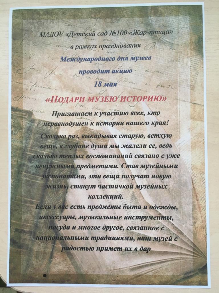 18 мая - Международный день музеев.МАДОУ №100 "Жар-птица" проводит акцию "Подари музею историю" -