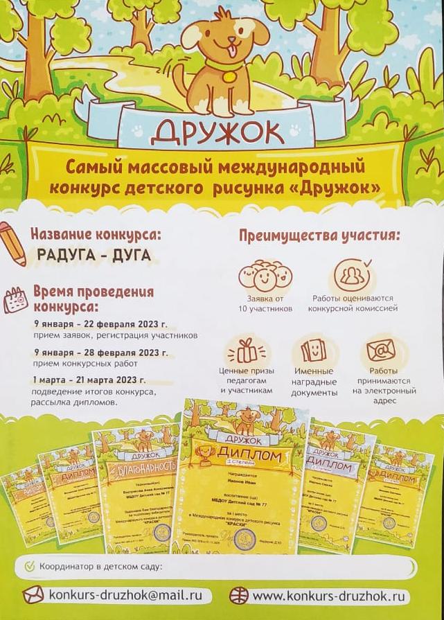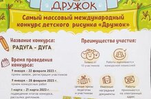 УВАЖАЕМЫЕ РОДИТЕЛИ ПРИГЛАШАЕМ ВАС ПОУЧАСТВОВАТЬ АМЕСТЕ С ДЕТЬМИ В МЕЖДУНАРОДНЫХ КОНКУРСАХ ДЕТСКОГО РИСУНКА "ДРУЖОК" И "БУКЕТИКИ", которые пройдут с 09.01.2023- 21.03.2023 года, и с 16.01.2023г. по 03.04.2023г. ДРУЖОК БУКЕТИКИ