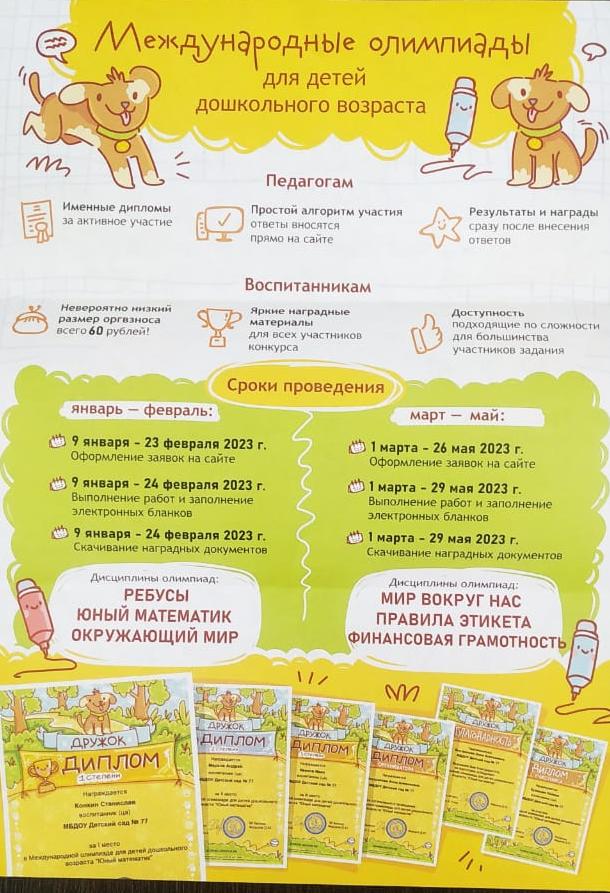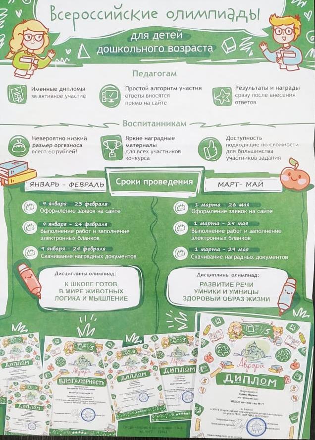 МЕЖДУНАРОДНЫЕ И ВСЕРОССИЙСКИЕ ОЛИМПИАДЫ доступные для детей дошкольного возраста, ждут воспитанников с января 2023 года по май 2023 года. Это интересно, увлекательно и познавательно. Вы сможете оценить уровеь интеллектуальной подготовки своего ребёнка про направлениям - математика, окружающий мир, финансовая грамотность, развитие речи, логика и мышление, в мире животных и многое многое другое.... Всероссийские олимпиады Олимпиады международного уровня