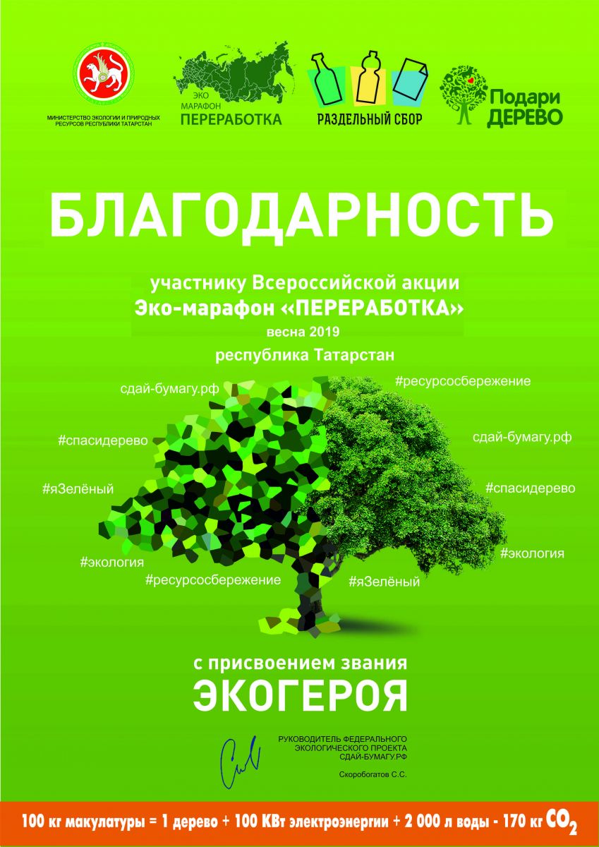 Благодарность за участие в проекте "Сдай макулатуру - спаси дерево".