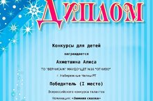 Поздравляем Ахметшину Алису, творческое объединение «Вернисаж» МАУ ДО «ЦДТ №16 Огниво» и руководителя Серову Татьяну Ивановну с результативным участие во Всероссийском конкурсе талантов: диплом победителя (1 место) в номинации «Зимняя сказка».