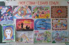 Обучающимися в творческом объединении "Радуга", руководитель Краснова И. В., была оформлена выставка "Моя страна - единая семья", собранная из лучших конкурсных композиций юных художников 2017 - 2019 г.г.