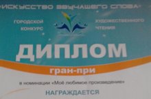 В апреле в ДЮЦ № 14 прошёл городской конкурс художественного чтения «Искусство звучащего слова». В нём приняла участие Нуриева Аделя, обучающаяся в объединении «Берлишек», руководитель Сафиуллина Н. Г., в номинации «Моё любимое произведение». Аделя получила диплом Гран – при. Поздравляем!