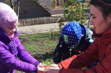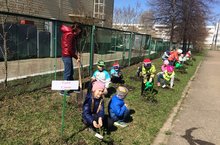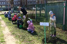 Воспитанники детского сада ухаживают за деревьями на «Аллее Наследия», которые были высажены в 2015 году в честь выпускников детского сада.
