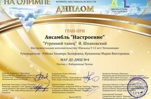 Поздравляем Ансамбль "Настроение" и их преподавателей Рябову Э.З. и Куманееву М.В. с победой в Международном конкурсе-фестивале "На Олимпе". Они удостоены самой высокой награды - Гран-При.