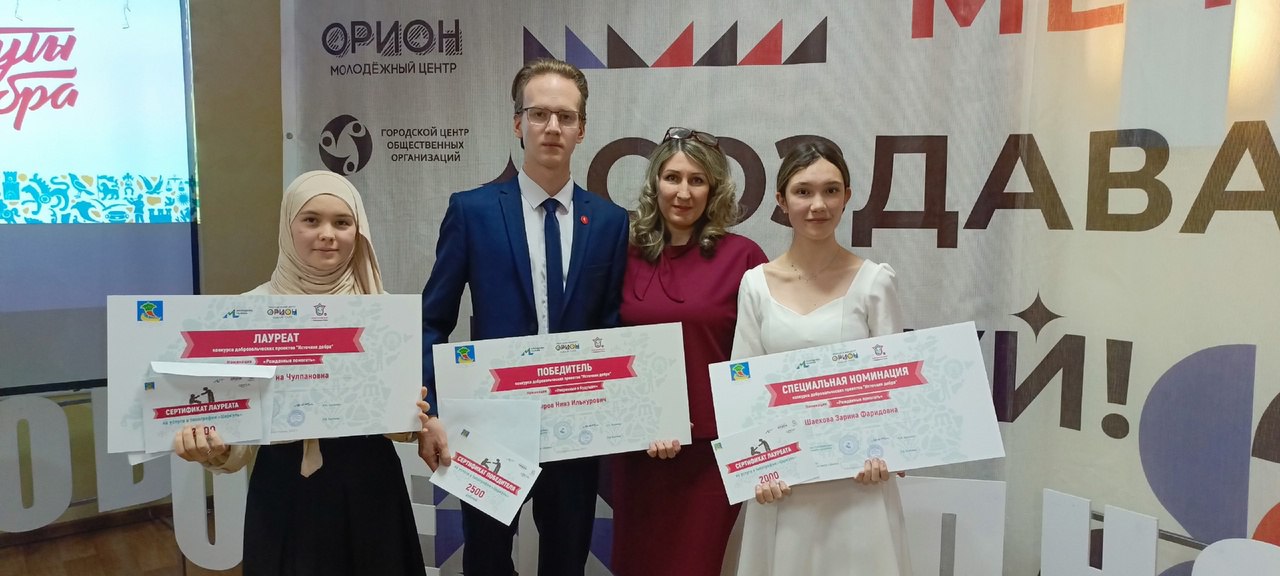 25 октября в МЦ "Орион" прошла церемония награждения городского конкурса "Источник добра" в рамках Городского добровольческого форума. спешим сообщить, что все наши участники вошли в число победителей. Студентка 4 курса Шаехова Зарина удостоена диплома в спец номинации, её проект "Вдохновение" получил грант и успешно реализуется в МЦ "Шатлык". Наш командир ВО "Солнце", студентка 2 курса Фахриева Алина получила диплом 3 степени, её проект "Сердце к сердцу" по работе с пожилыми начинает свою реализацию. И студент 1 курса Басыров Нияз стал Победителем в своей номинации, его проект по профилактике школьников "Белые халаты" уже запущен в реализацию и ждёт следующего выхода к школьникам.