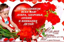 Дорогие наши мамы! Поздравляем вас от всей души с Днем Матери. Желаем каждой из вас быть самой любимой мамой на свете для своего ребенка. Желаем чтобы дети радовали вас своими достижениями и успехами. Желаем взаимопонимания в отношениях и искреннего доверия, невероятных чудес в жизни и вечной любви в ваших сердцах.
