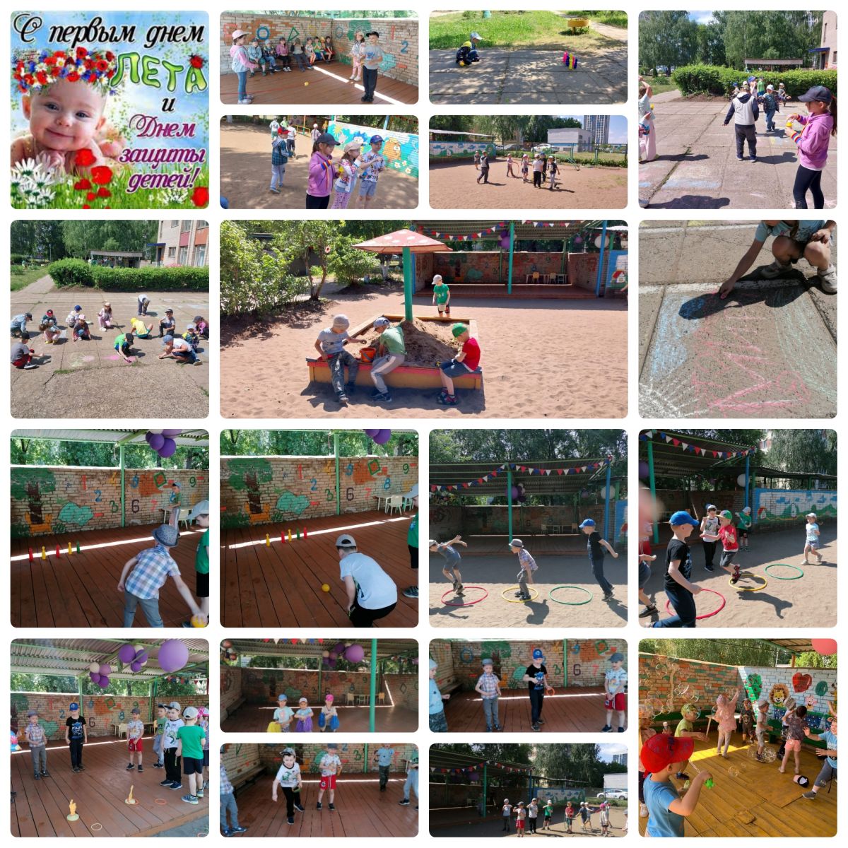 1 июня в нашем детском саду прошли развлечения в каждой группе. Выполнялись музыкально-ритмические упражнения на групповых участках. Дети с удовольствием принимали участие в соревнованиях и эстафетах, а так же получили массу положительных эмоций от надувания мыльных пузырей. А также не обошлось от любимого всеми детьми рисованием на асфальте