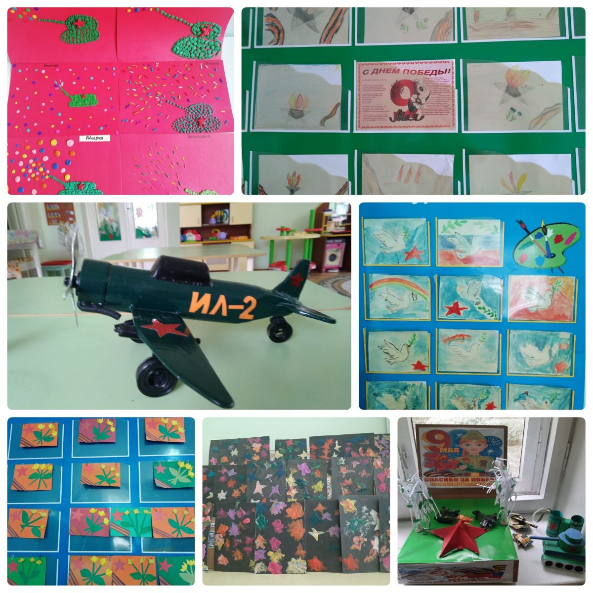 С целью воспитания у детей патриотических чувств, интереса к ее героическому прошлому, уважения к павшим защитникам Родины, дети вместе с родителями и воспитателями нарисовали рисунки, сделали поделки к празднику «День Победы!».