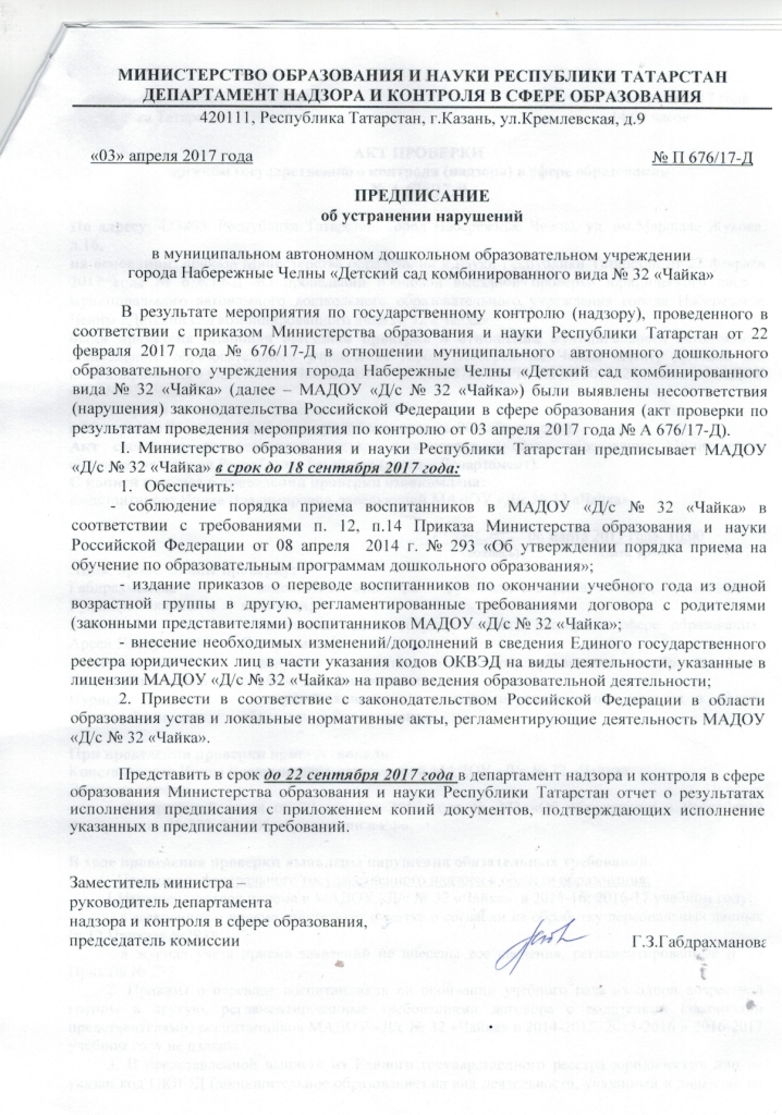 Предписание МО и Н РТ департамент надзора и контроля в сфере образования ( апрель, 2017)