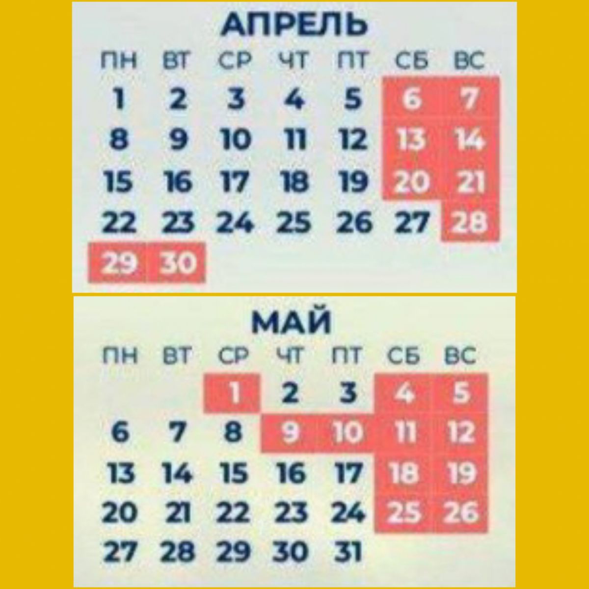 28, 29, 30 апреля и 1 мая — выходные на Праздник Весны и Труда, который приходится на среду;с 9 по 12 мая — четырехдневные каникулы связаны с Днем Победы.
