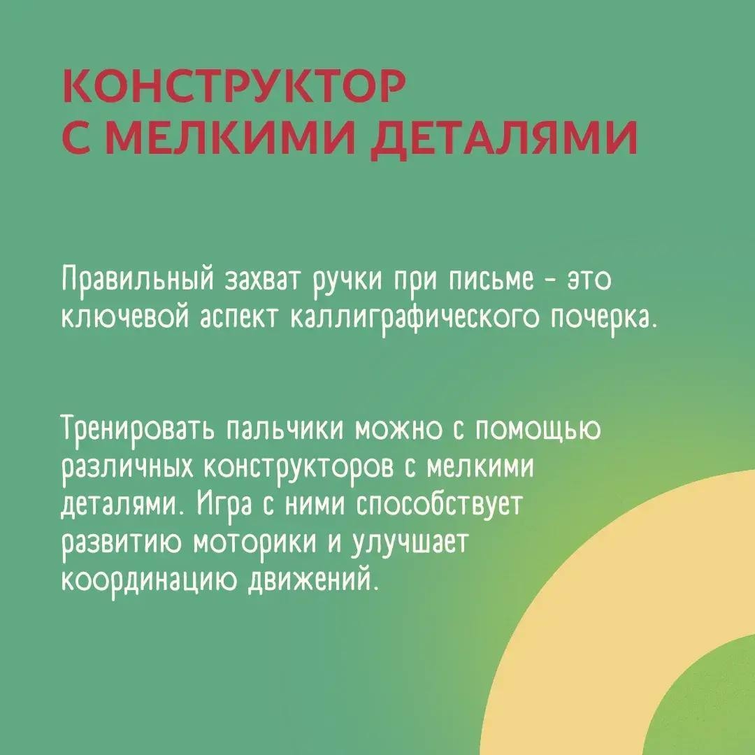 Залог красивого почерка – развитая моторика. Лепка из пластилина и сборка конструктора помогут освоить азы каллиграфии. Но это не единственные помощники! Подробности в наших карточках.