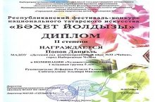 В первый день зимы в МАОУ ДОД «Городской дворец творчества детей и молодежи № 1» г. Набережные Челны прошел Открытый фестиваль-конкурс национального татарского искусства «Бәхет йөлдызы». Цель фестиваля: выявление наиболее одаренных исполнителей в области национального татарского искусства. Наш воспитанник Попов Даниэль стал лауреатом II степени в номинации "Художественное слово"