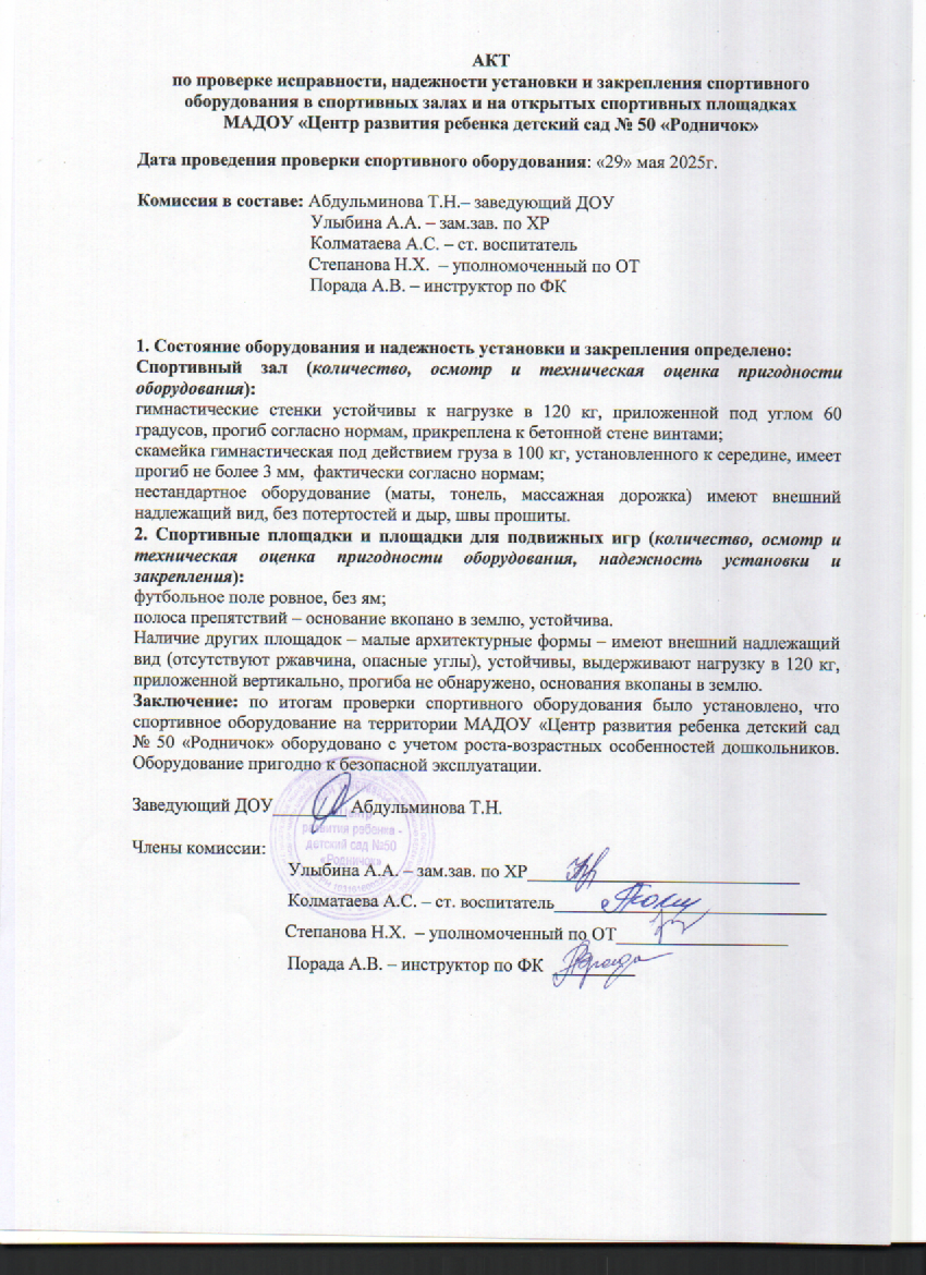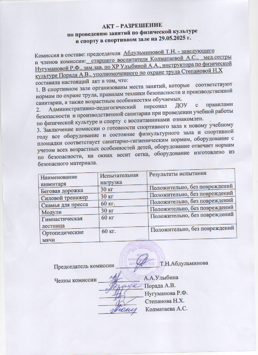 Акт разрешения на проведение занятий по физической культуре в спортивном зале