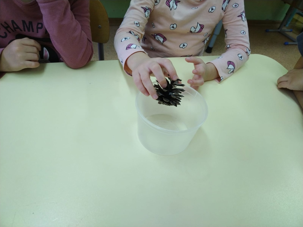 С помощью опыта воспитанники сделали вывод, что под воздействием влаги и тепла шишка свои чешуйки закрывает, а когда тепло и сухо – чешуйки раскрываются.