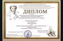 Дипломом II степени в III Республиканском открытом конкурсе творчества "Я памятник воздвиг себе нерукотворный..." посвященный великому русскому поэту А.С.Пушкину в номинации "Видеоролики", награждается Зевакина Виктория воспитанница подготовительной группы №10,наставник Сафина Гульсия Аухатовна. Гордимся успехом и желаем новых творческих достижений!