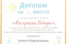 09.05.23 прошел конкурс рисунков на асфальте «Все краски Победы», посвященного празднованию 78-ой годовщины Победы в Великой Отечественной войне 1941-1945 г.г. среди дошкольных образовательных учреждений Автозаводского района. Поздравляем, семья Корчагиных занявших III место в номинации «Ни кто не забыт и ни что не забыто».