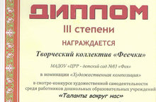 5 марта состоялся гала-концерт смотра-конкурса художественной самодеятельности среди работников ДОУ г.Набережные Челны. Творческий коллектив "Феечки "награжден допломом III степени в номинации "Художестивенная композиция. "