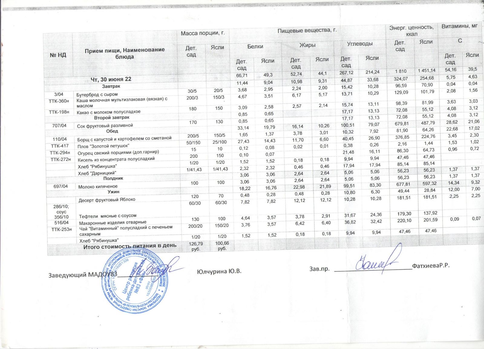 меню на 30 июня 2022
