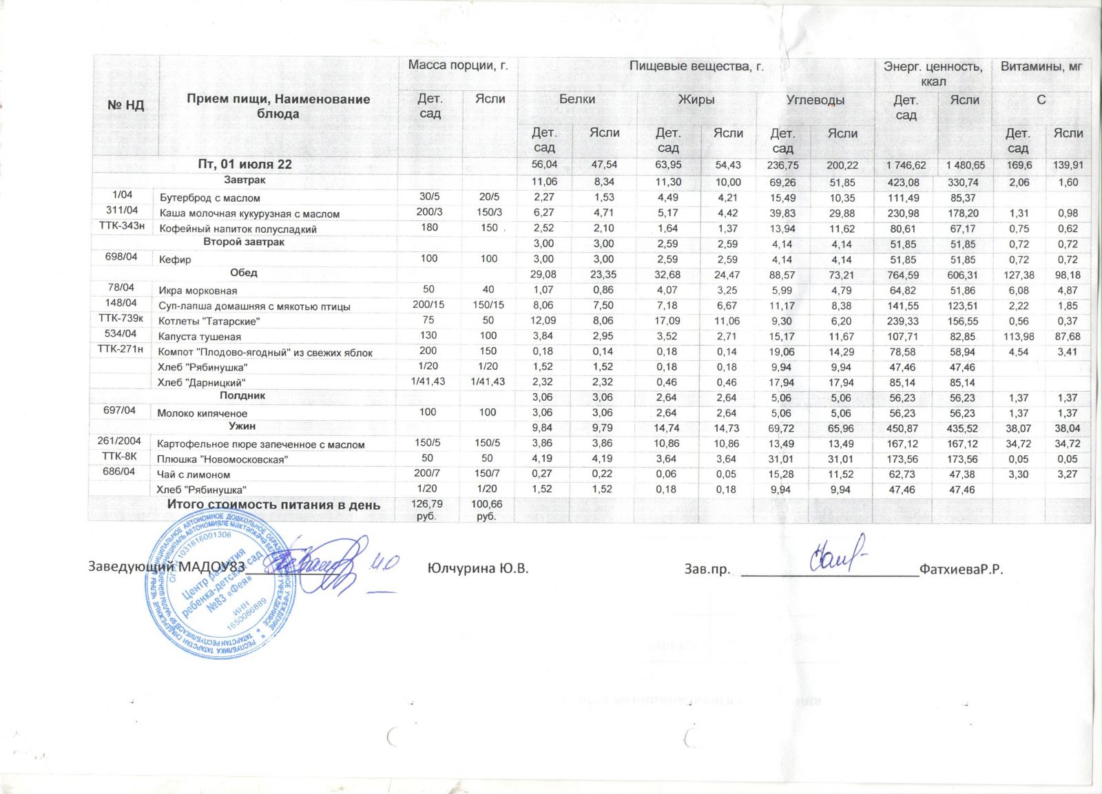 Меню на 01 июля 2022