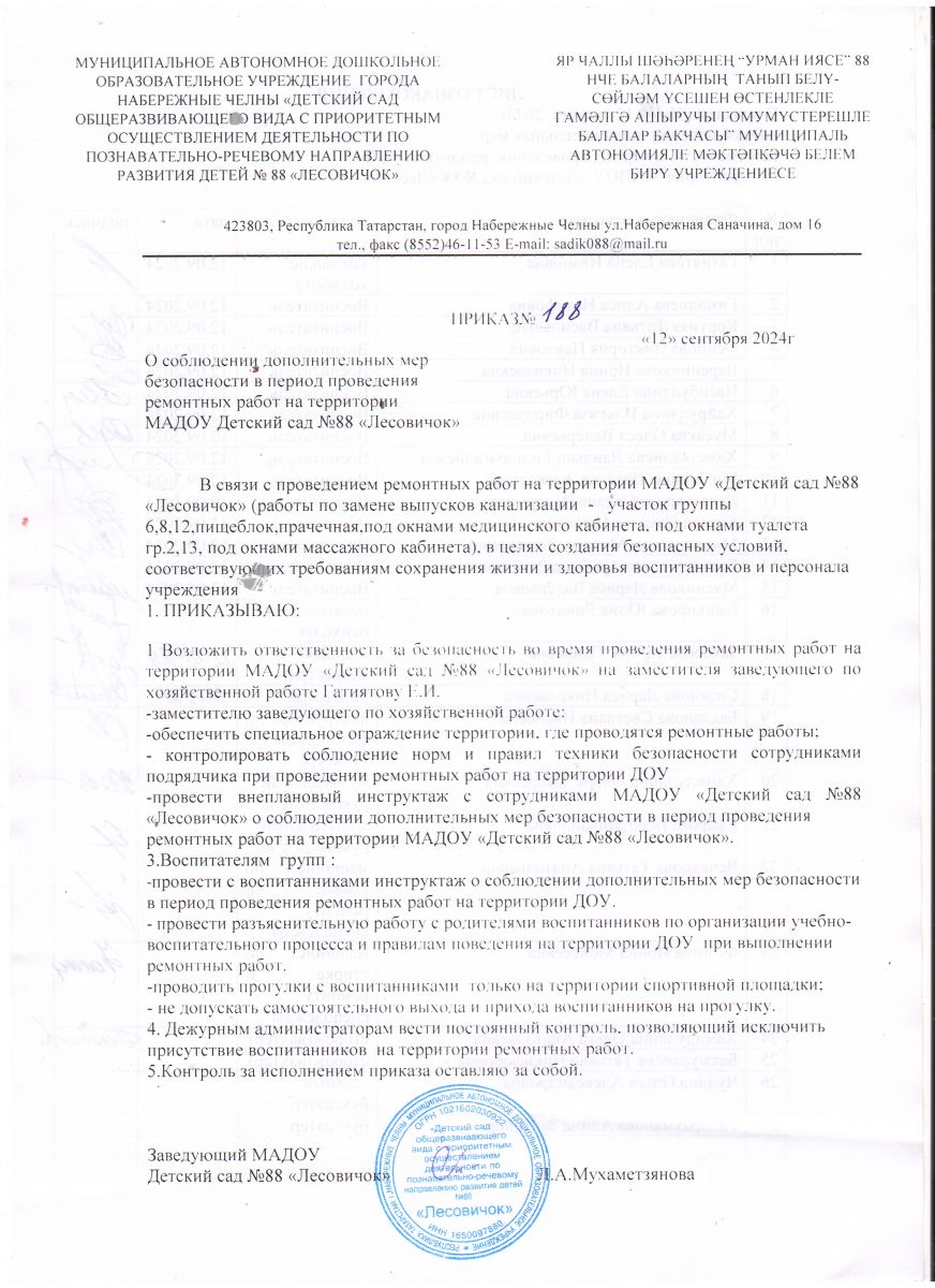 Уважаемые родители и гости детского сада № 88 "Лесовичок", с 12.09.2024 года на территории детского сада будут проводиться ремонтные работы по замене выпусков канализации./Приказ.jpg