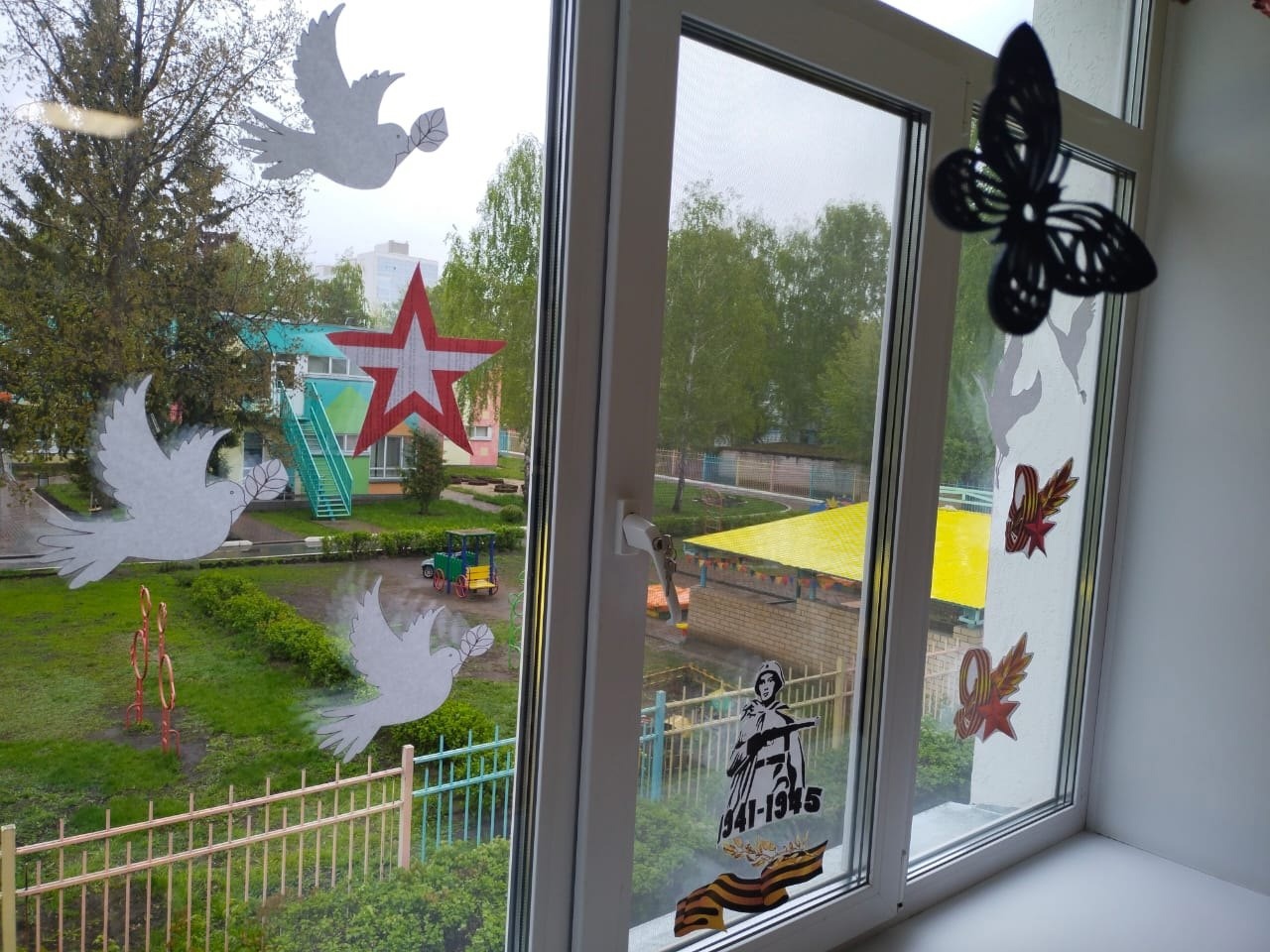 Наш детский сад присоединился к Всероссийской акции "Окна Победы". Педагоги совместно с детьми украсили окна своих групп главными символами победы – Вечным огнем, звездами, георгиевскими лентами и белыми журавлями.
