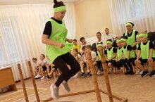 На базе нашего детского сада прошел отборочный тур среди детских садов Центрального района Регионального фестиваля по спортивным прыжкам через резинку "Счастливое детство". В рамках данного фестиваля ,наш инструктор по физической культуре,Юлия Сергеевна,заняла 3 место в номинации методическая разработка "Прыжки без границ".
