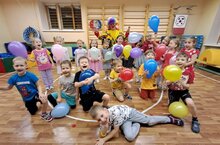 В спортивном зале, украшенном яркими шарами, детей ждал веселый клоун с радужным носом и ярким нарядом. С улыбкой на лице он приветствовал малышей, раздавая воздушные шарики.