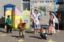 Организовывая праздник, мы старались следовать общим традициям. Праздник проводился на свежем воздухе. Сочная зеленая травка, яркая зелень деревьев, сочеталась с различными украшениями - разноцветными флажками и ленточками, шарами.