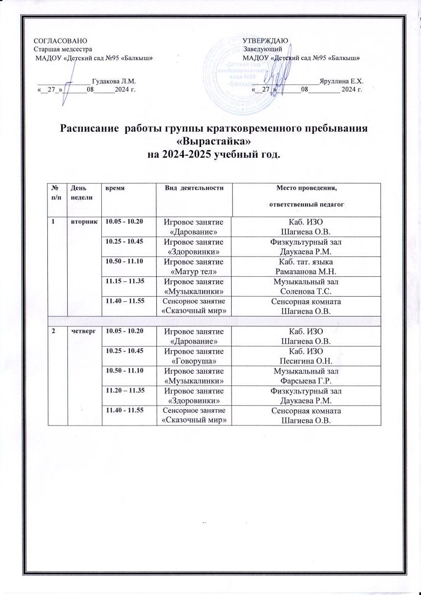 - Расписание работы группы кратковременного пребывания Вырастайк