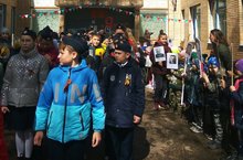 Колонна педагогов и воспитанников,родителей детского сада «Маленький принц» и учеников «Кадетская школа №49» пронесли транспаранты с фотопортретами своих родственников, участвовавших в Великой Отечественной войне .