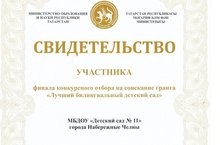 «Йолдыз» 11-нче балалар бакчасы» МБМББУ коллективы “Иң яхшы билингваль балалар бакчасы” конкурсының сайлап алу этабында катнашучы таныклыгы белән бүләкләнде.