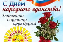 Дорогие родители наших воспитанников, сотрудники нашего сада и гости сайта! Поздравляем вас с Днём народного единства. Желаем вам всем мира в доме и лада в семье, жить в согласии друг с другом и гордиться своей Родиной. Только от нас зависит, какой будет наша Родина, наш общий дом. Только в наших силах сделать его красивым, уютным и гостеприимным. Давайте будем открытыми, добрыми и гордиться нашей общностью. И пусть в нашей стране всегда будет мир, уют и покой. С праздником!