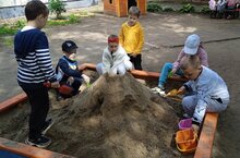 В летний период в детском саду воспитанники большую часть времени проводят на воздухе и, конечно же, играют с песком. Песочница является замечательной средой для включения воображения и создания сказочных сюжетов. В игре с песком ребёнок чувствует себя хозяином своего маленького мира, являясь режиссёром и автором своей сказки. Наши ребята всегда с особым творческим энтузиазмом создают песочные шедевры. Дети с удовольствием украшают песочные композиции, используют в работе природный и бросовый материал. Результатом такого увлечения являются многочисленные интересные и красивые постройки в песочницах на прогулочных площадках.