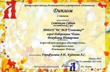 Наши творческие ребята очень радуют нас своими успехами! Наша воспитанница Ситдикова Сабина приняла участие во Всероссийском конкурсе "Палитра осени" от Центра всероссийских дистанционных олимпиад "Летописец", представив на суд жюри оригинальную композицию. Мастерство, умения и старания Сабины принесли ей заслуженную победу и диплом I степени. Поздравляем Сабину и её творческих наставников - воспитателей Гарифуллину Лилию Ильхамовну и Кудинову Анастасию Сергеевну - с блестящим успехом и желаем покорения новых вершин!