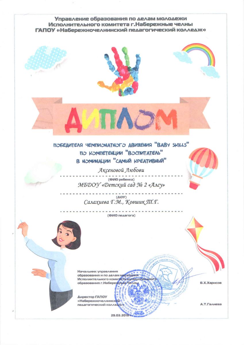 Наша воспитанница подготовительной группы № 11 Аксенова Люба (педагоги Салахиева Г.М., Ковшик Т.Г.) стала победителем в компетенции "Воспитатель" в номинации "Самый креативный". От всей души поздравляем и желаем дальнейших творческих успехов!