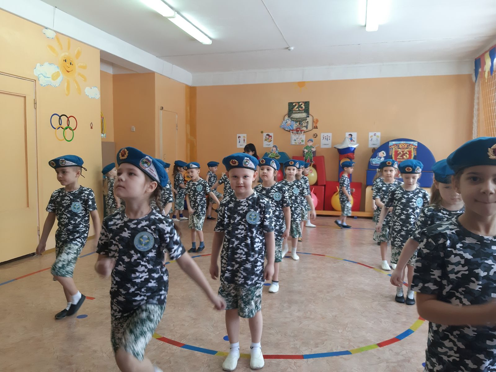 Воспитанники старших и подготовительных групп вместе со своими педагогами представили определенный род войск, продемонстрировали свои навыки строевой подготовки, выполняли команды и торжественным строем прошли перед членами жюри смотра-конкурса с исполнением патриотической песни. Почётнымм гостями и членами жюри были папы наших воспитанников.