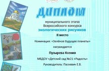 Воспитанница нашего ДОУ Пузырева Ксения приняла участие и получила диплом за 2 место в муниципальном этапе Всероссийского конкурса экологических рисунков. Целью данного конкурса является привлечение внимания детей к проблемам сохранения окружающей среды , формирование экологически грамотного стиля жизни и повышения уровня экологической культуры, усиление роли художественного творчества как средства экологического и гражданско-патриотического воспитания. Поздравляем!
