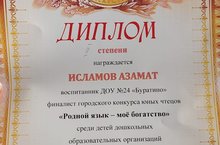 Сегодня в детском саду "Веселинка" прошел городской конкурс юных чтецов "Родной язык - моё богатство" среди дошкольных образовательных организаций. Финалистом стал и наш воспитанник Исламов Азамат. Его наградили Дипломом II степени.