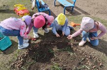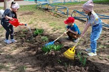 В нашем детском саду дети вместе с воспитателями продолжают облагораживать территорию - готовят цветники и клумбы к летнему сезону. Пока еще на них можно увидеть только рыхлую землю, но умелые руки не бояться работы и скоро здесь будут цветущие клумбы –нам на радость, гостям на загляденье!