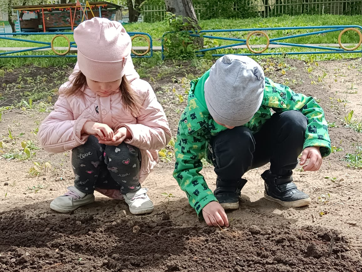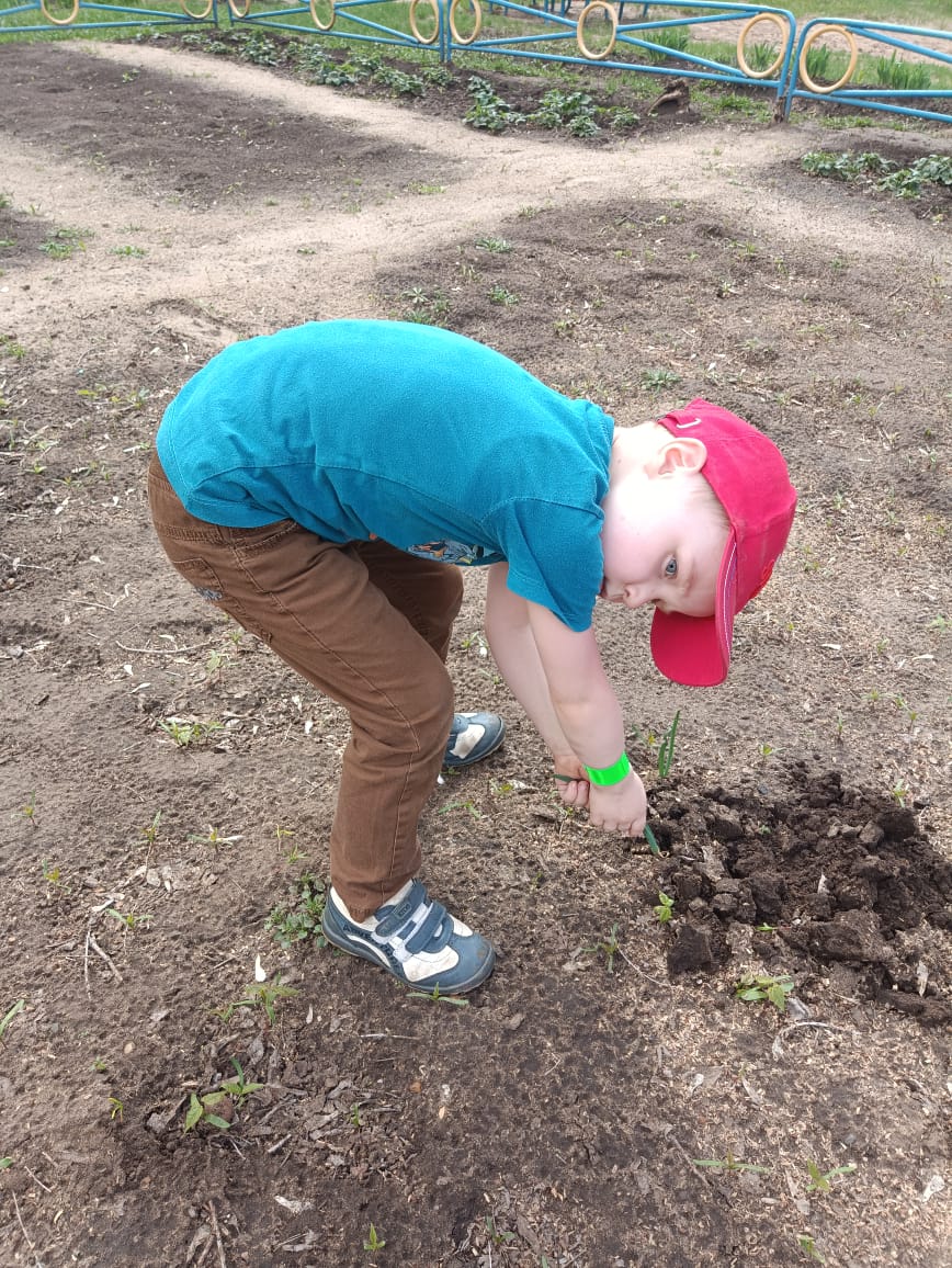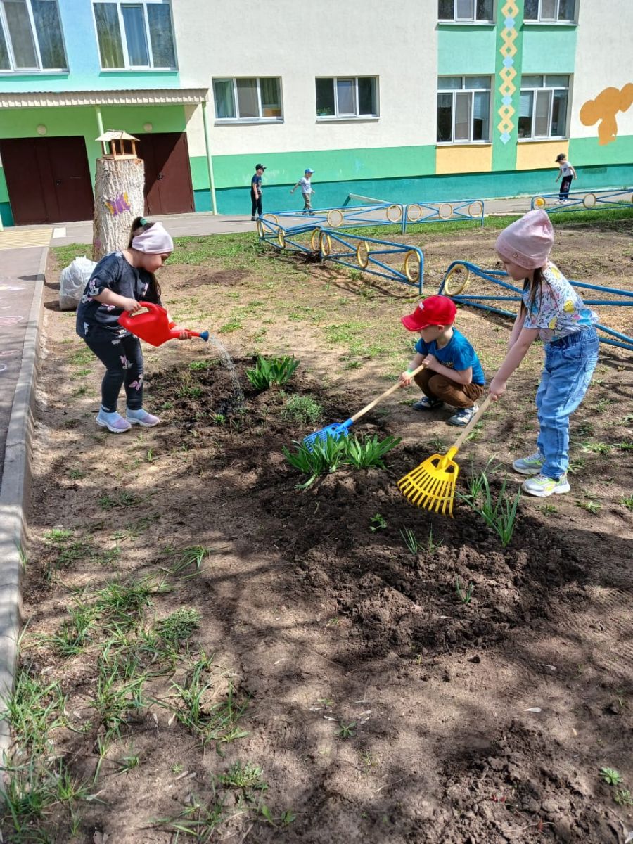 Прошел веселый праздник Первомай и воспитанники нашего детского сада вместе с воспитателями продолжают облагораживать территорию – подметают участки, приводят в порядок скамеечки, а малыши средней группы приступили к посадке семян на огородной грядке.