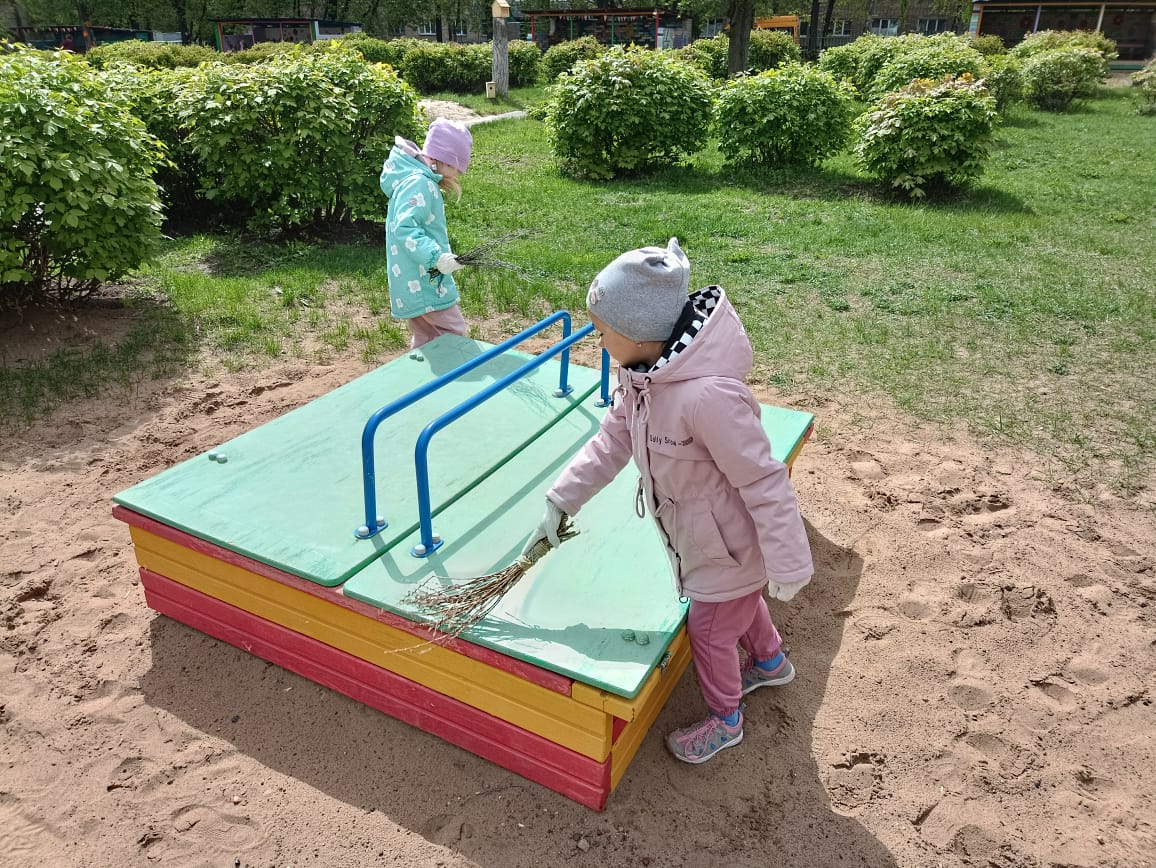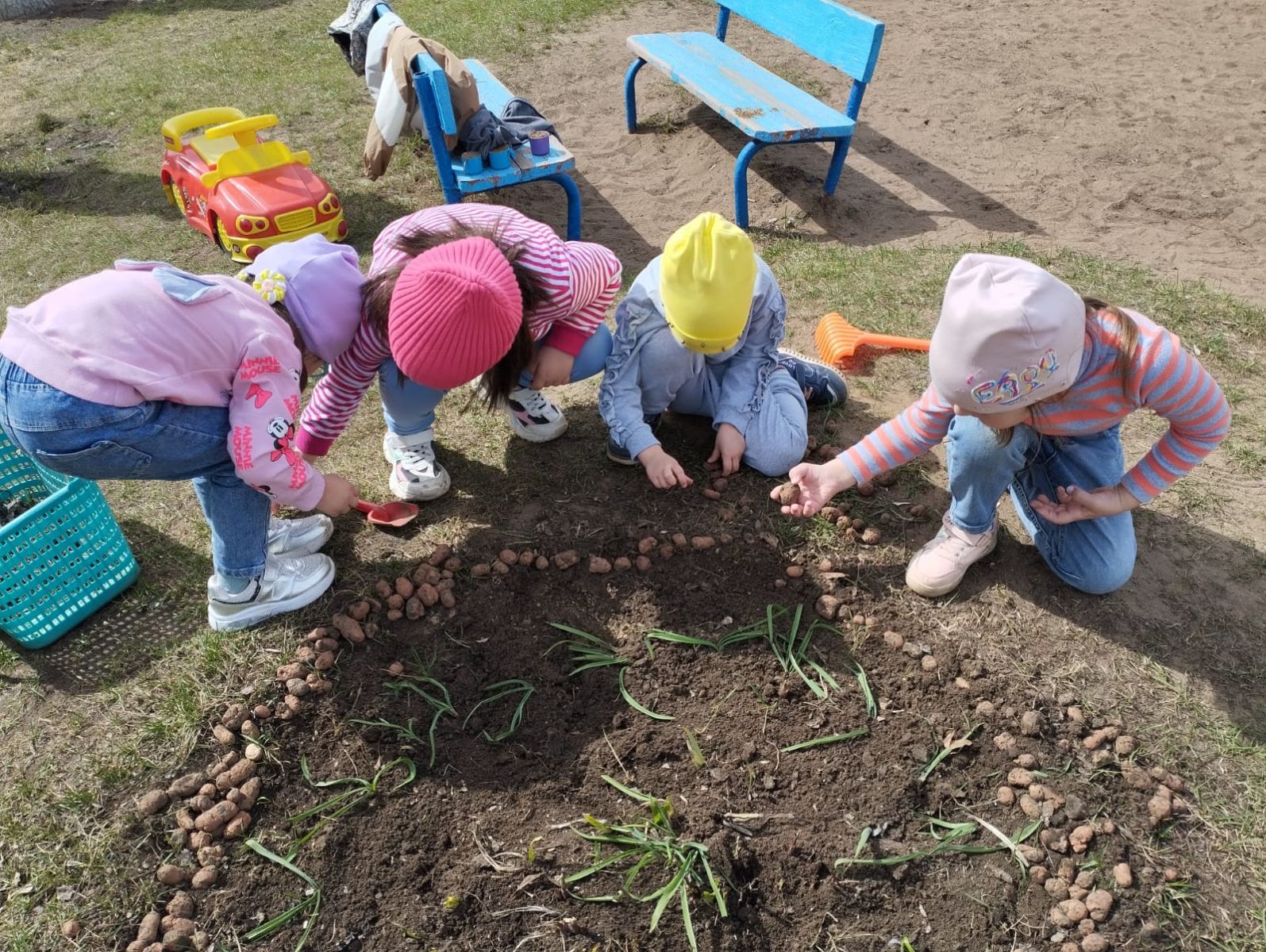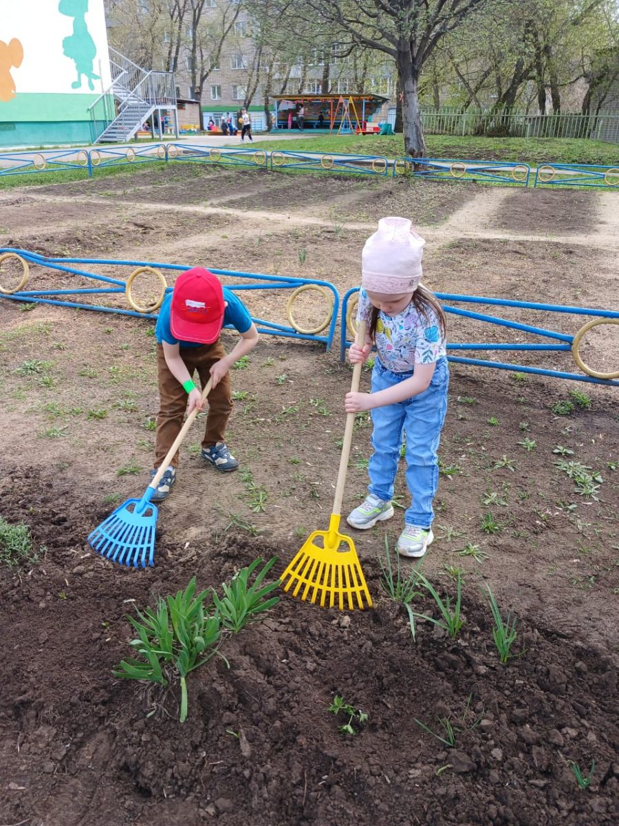 Прошел веселый праздник Первомай и воспитанники нашего детского сада вместе с воспитателями продолжают облагораживать территорию – подметают участки, приводят в порядок скамеечки, а малыши средней группы приступили к посадке семян на огородной грядке.