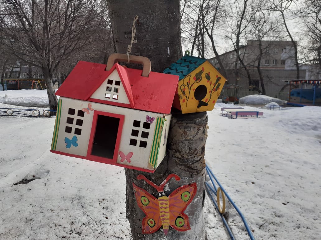В нашем детском саду продолжается акция по изготовлению кормушек и скворечников для птиц. Чем больше мы развесим кормушек, тем больше разнообразных птиц поселяться в нашем городе.