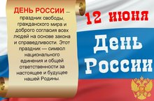 Сегодня День России все более приобретает патриотические черты и становится символом национального единения и общей ответственности за настоящее и будущее нашей Родины. Это праздник свободы, гражданского мира и доброго согласия всех людей на основе закона и справедливости. В этот день по всей стране проходит множество торжественных и праздничных мероприятий, в которых принимают участие жители нашей страны всех возрастов.