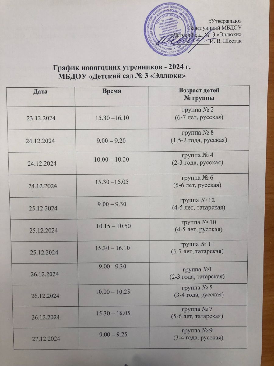 График новогодних утренников - 2024г.
