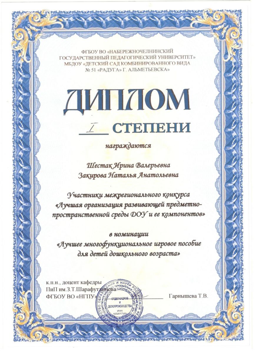 10. Диплом межрегионального конкурса "Лучшая организация РППС ДОУ и её компонентов" (г. Альметьевск)