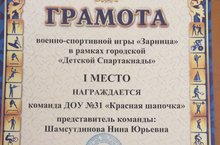 Поздравляем команду нашего сада, занявшую призовое первое место в спортивных соревнованиях "Зарница" в рамках детской "Спартакиады 2018" среди ДОУ города.