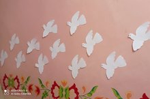В честь Дня Победы в детском саду прошла акция "Голубь мира". Дети изготовили голубей, которыми украсили территорию детского сада, а также вечером вручали их родителям.