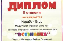 Поздравляем Карабан Егора победителя городского интеллектуального конкурса "Всезнайка", воспитанника логопедической группы №2 . Руководитель: Мальченко Л.Г., воспитатель.