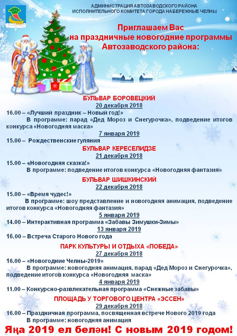 Опубликовано: 14.12.2018Приглашаем Вас на праздничные новогодние мероприятия Автозаводского района. Полная афиша здесь